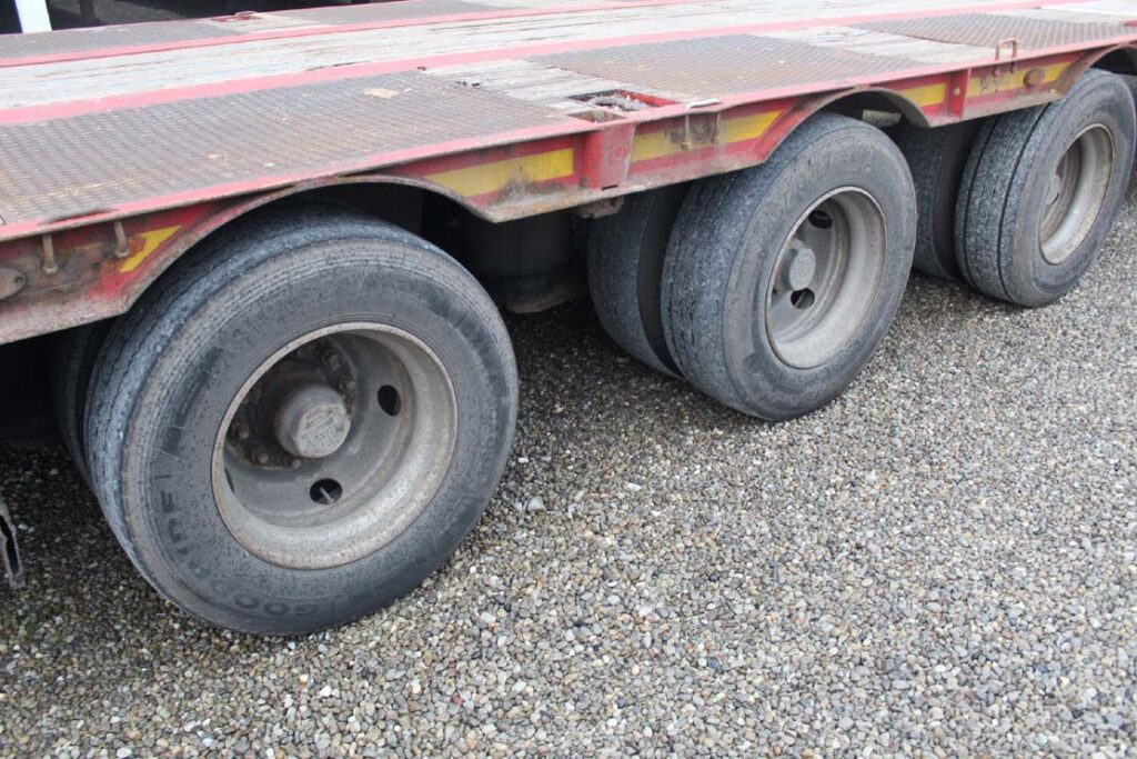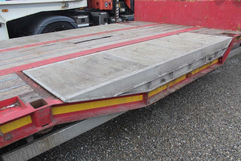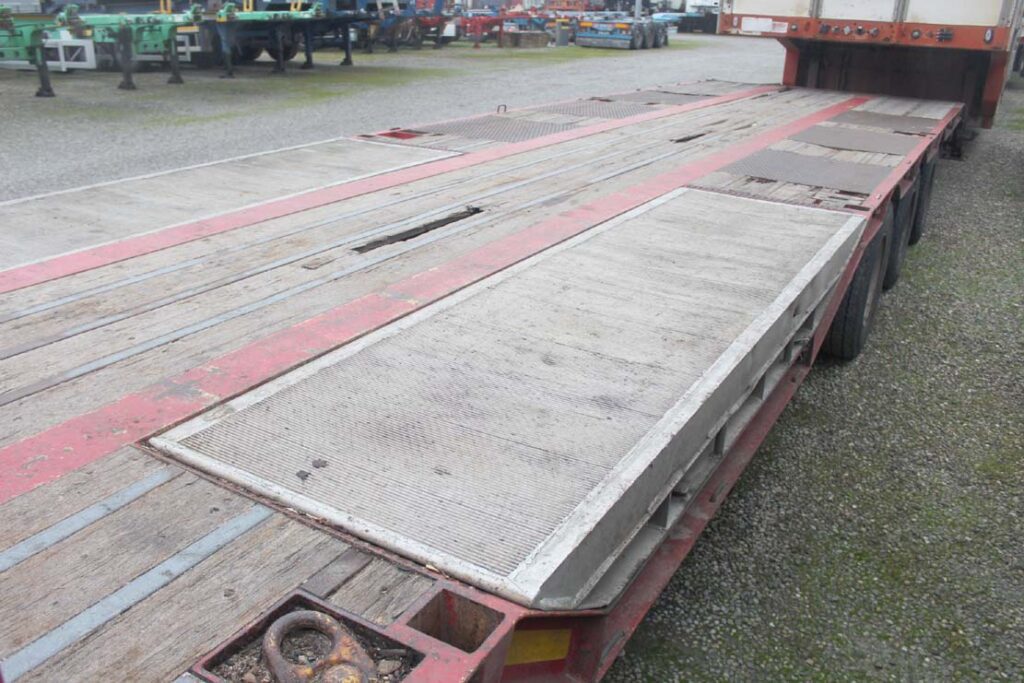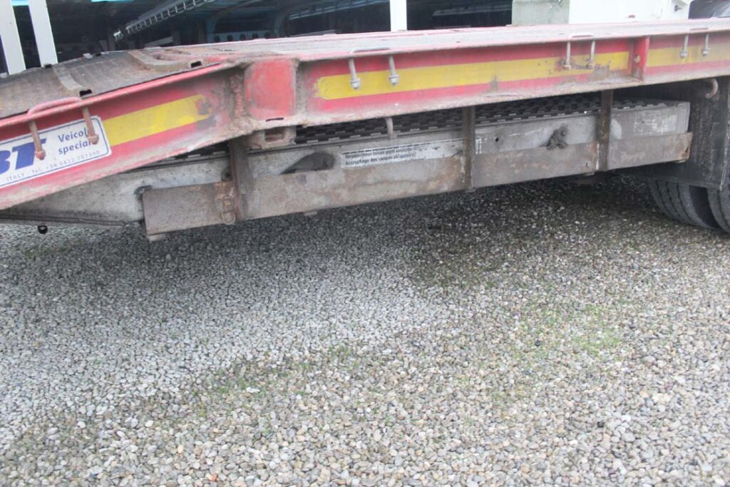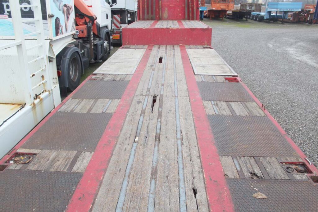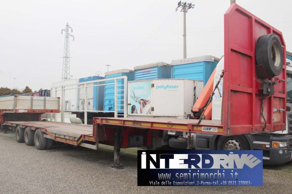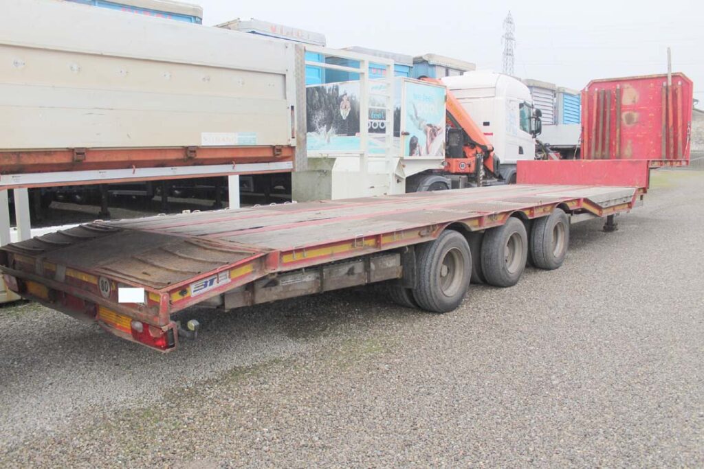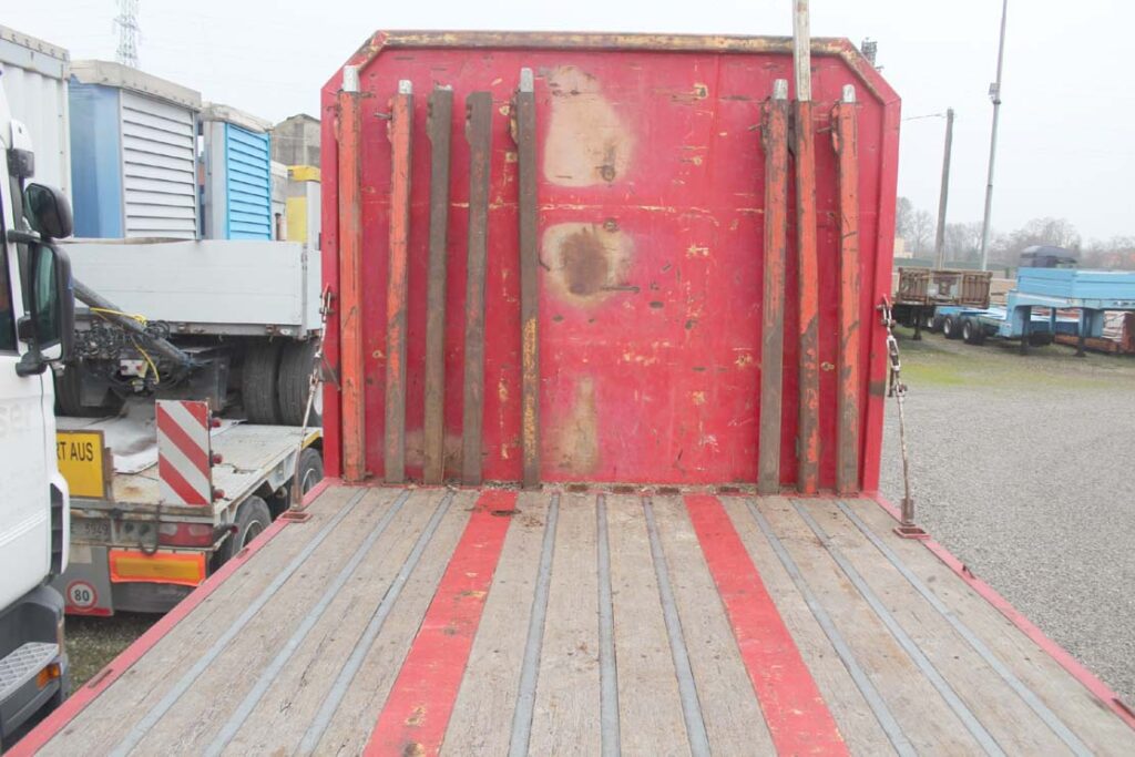 - Allestimento: semirimorchio carrellone buche toresan usato a pianale ribassato collo d’oca con abbassamenti centrali tra collo e primo assale da 20cm di profondità con tappi amovibili in alluminio, 2.70m di lunghezza buche, rampe posteriori estraibili ricoverate sotto pianale, n°6 sedi piantane in tubolare quadro laterali con n°8 pali compresi, travesrsa anteriore per alloggio piantane a riposo, sospensioni pneumatiche, ebs, tesata anteriore rinforzata da 240cm di altezza, piedi posteriori equilibratori, ganci rud laterali al pianale, coda inclonata posteriore per invito al carcico con apertura manuale per alloggio rampe in alluminio da 2.70m di lunghezza, ben gommato.