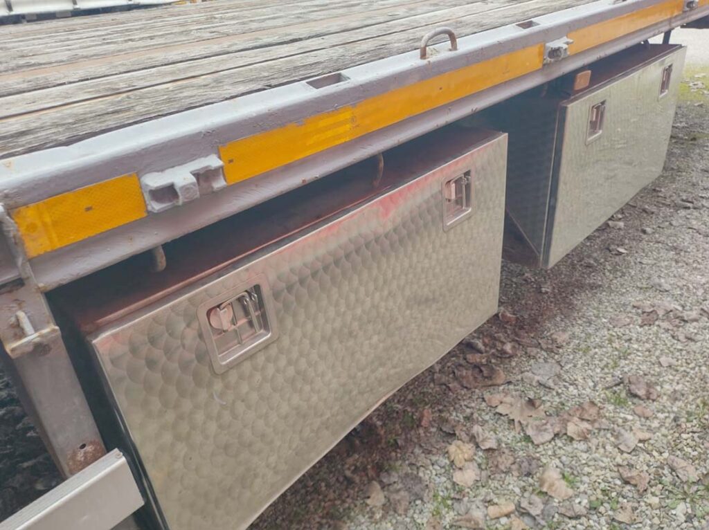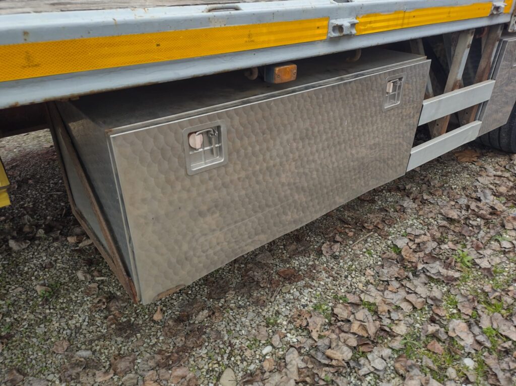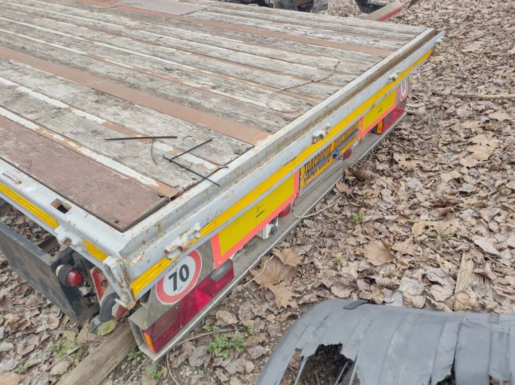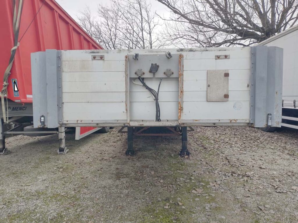 - Allestimento: semirimorchio pianalato ribassato Zorzi usato aperto a pianale mega con aggancio massimo a 105 cm di altezza, testata anteriore da 80cm, predisposizione rampe posteriori amovibili, sospensioni pneuamtiche, abs, valvola regolazione assetto, coppie di ganci collari laterali a scomparsa, n°4 traverse twist x alloggio di container da 20 piedi e 30 piedi, n°3 cassettoni porta attrezzi inox, para urto inox, 1° assale sollevabile e 3°sterzante.