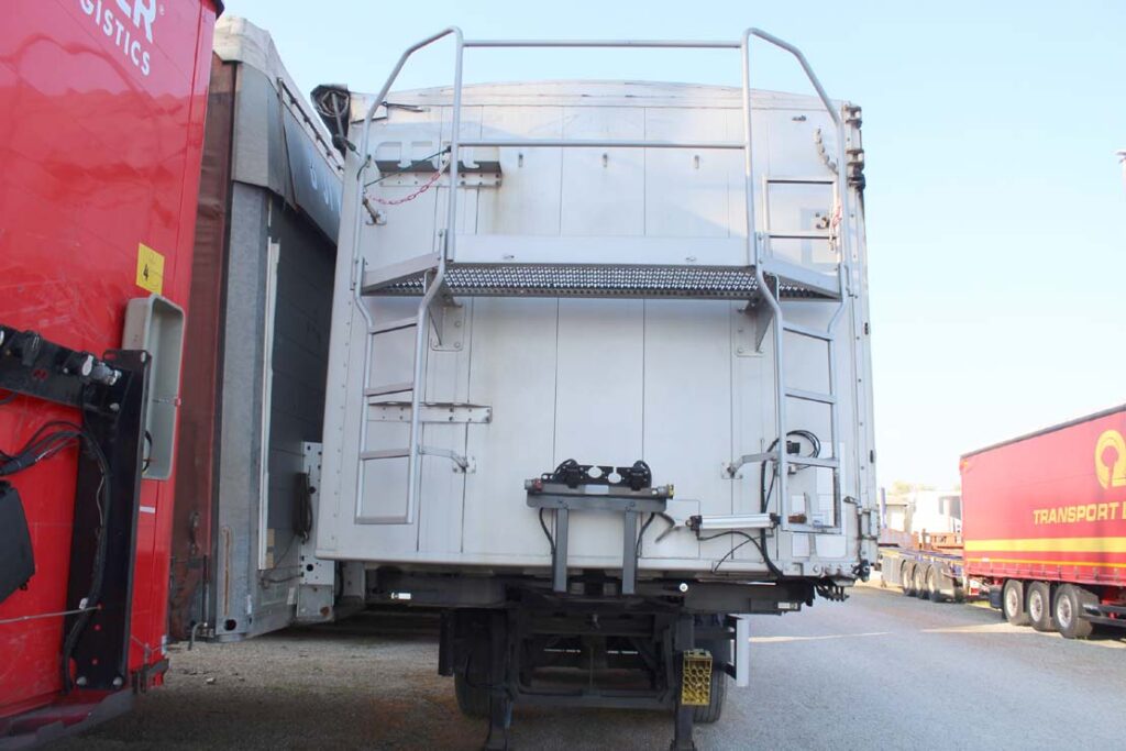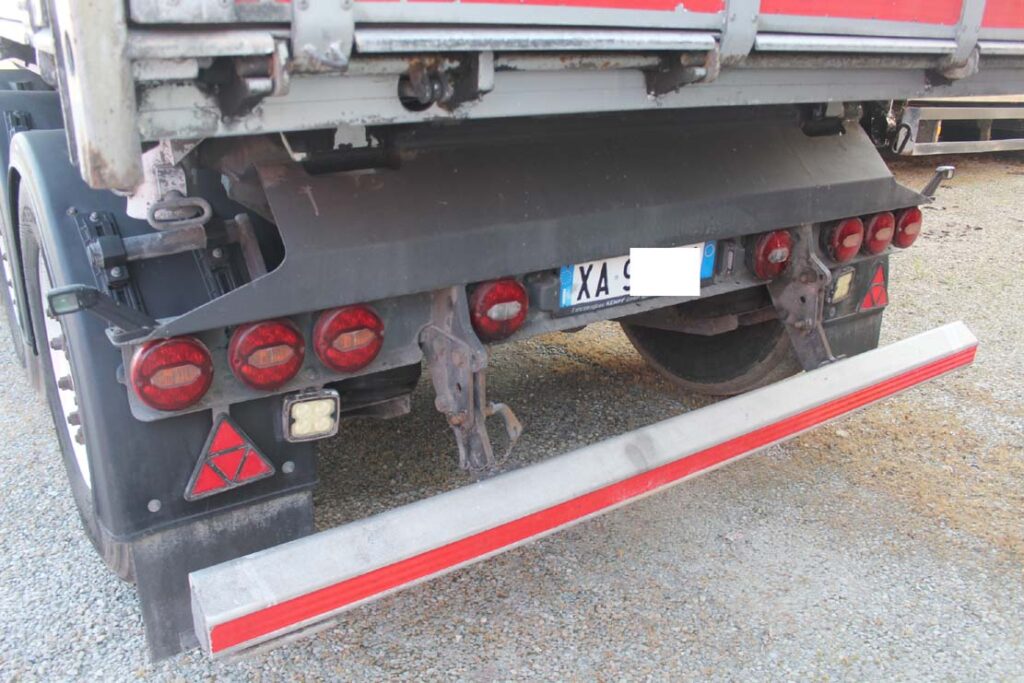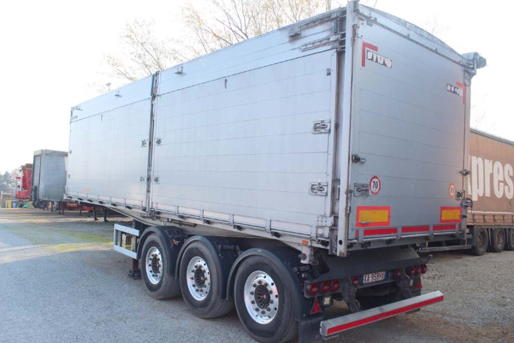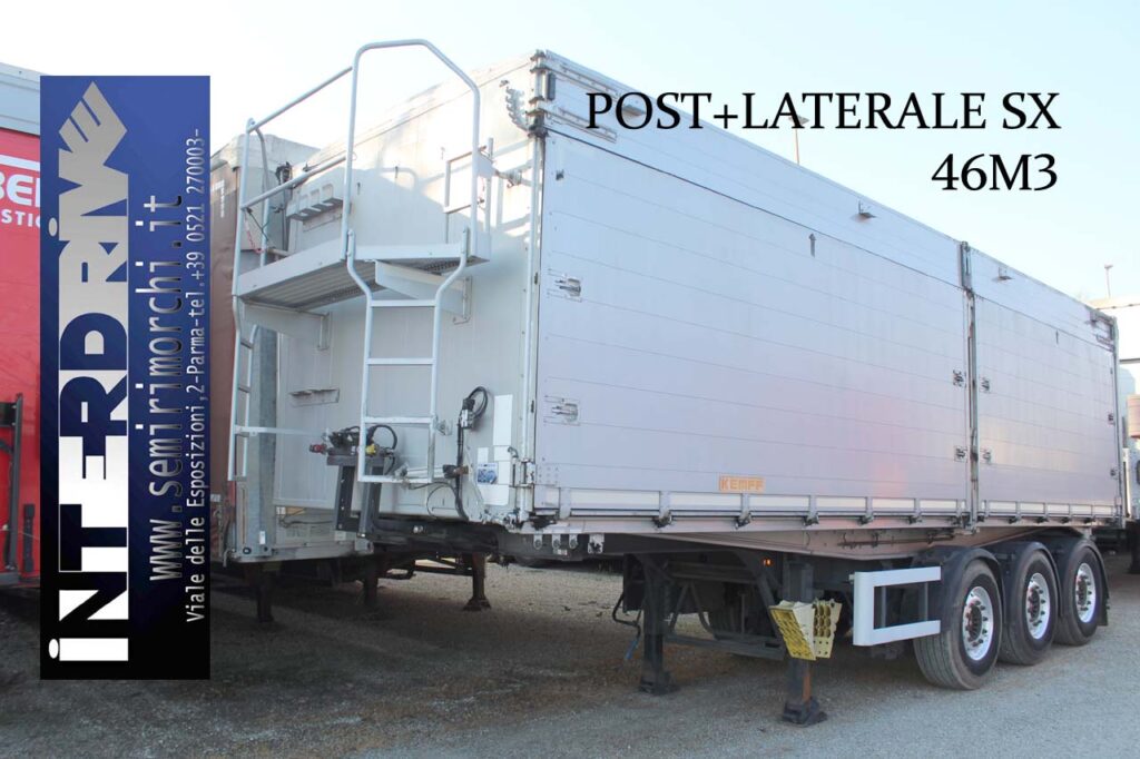 - Allestimento: semirimorchio ribaltabile laterale posteriore Kempf usato con sponde laterali apribili solo lato sinistro in 2 sezioni, altezza sponde 1.80m + 40cm di sovrasponda con apertura a bandiera, totale altezzza sponde 2.20m, portellone posteriore a tenuta stagna con apertura a bandiera e basculante, telaio in acciaio, fermi avvitabili posteriori al portellone , copri scopri cona vvolgitore telo laterale, scaletta anteriore di risalita con ballatoio, piedi a doppia velocità, catene interne di tenuta, para urto posteriore ribaltabile, 46m3 interni di capacità, cerchi in lega alcoa dura bright, innesto idraulico a mandata unica, ben gommato e pronto all’uso.