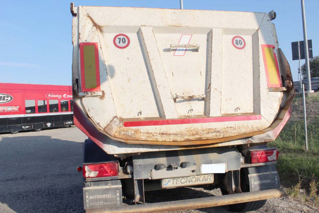 - Allestimento: semirimorchio ribaltabile vasca 26m3 tecnokar tonda usata posteriore da inerti con portellone basculante, finbitrice esterna, cassa in acciaio con cilindro frontale idraulico, tetto scorrevole con apertura copri scopri cramaro e telo in pvc, cassetta porta attrezzi, para urto posteriore girevole, piedi a doppia velocità, sospensioni pneumatiche con valvola regolazione assetto, ebs, innesti idraulici a doppia mandata, buone condizioni.