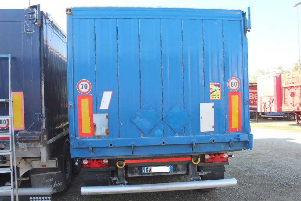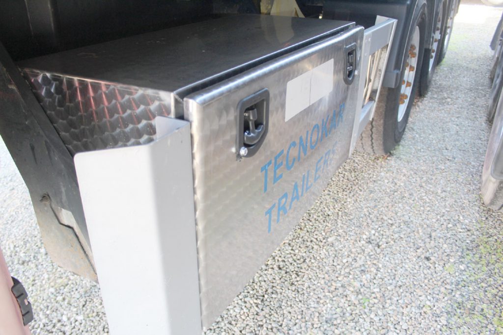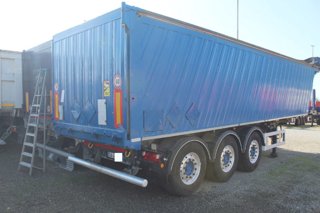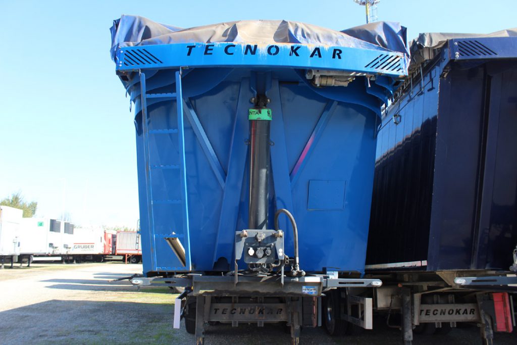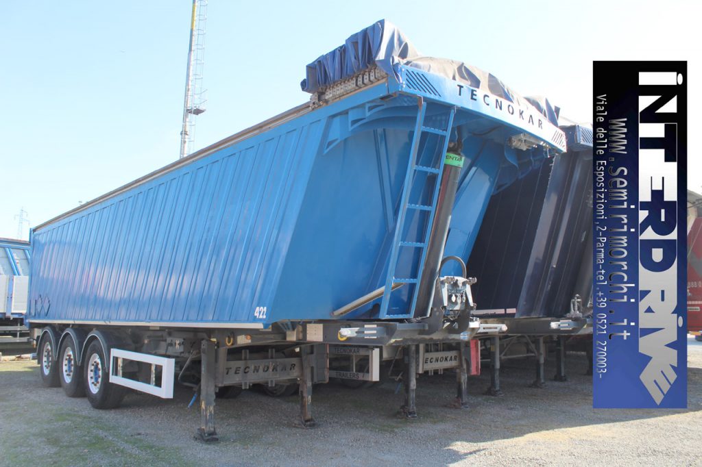 - Allestimento: semirimorchio vasca ribaltabile tecnokar usato 42m3 in acciao alleggerito con portellone postreiore ad apertura basculante e bandiera con tenuta stagna ermetica, sospensioni pneumatiche, cerchi in lega alcoa, tetto con copertura a copri scopri scorrevole elettrico cramaro con telo in pvc, cassetta porta attrezzi in inox da 100cm, ganci nave imo ro-ro al telaio, para urto posteriore ribaltabile, para cicli laterali in alluminio, cilindro frontale di ribaltamento con innesti idraulici a doppia mandata.